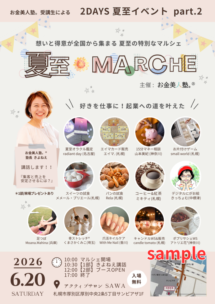 2026年6月20日(土曜日) 夏至のマルシェ(仮) 未分類 2026.03.132026.03.20 お金美人塾受講生による2days夏至イベントに出展が決定いたしました!!! 12:00~17:00 開催場所:北海道 札幌市 厚別区 中央2条5丁目サンピアザ1F
